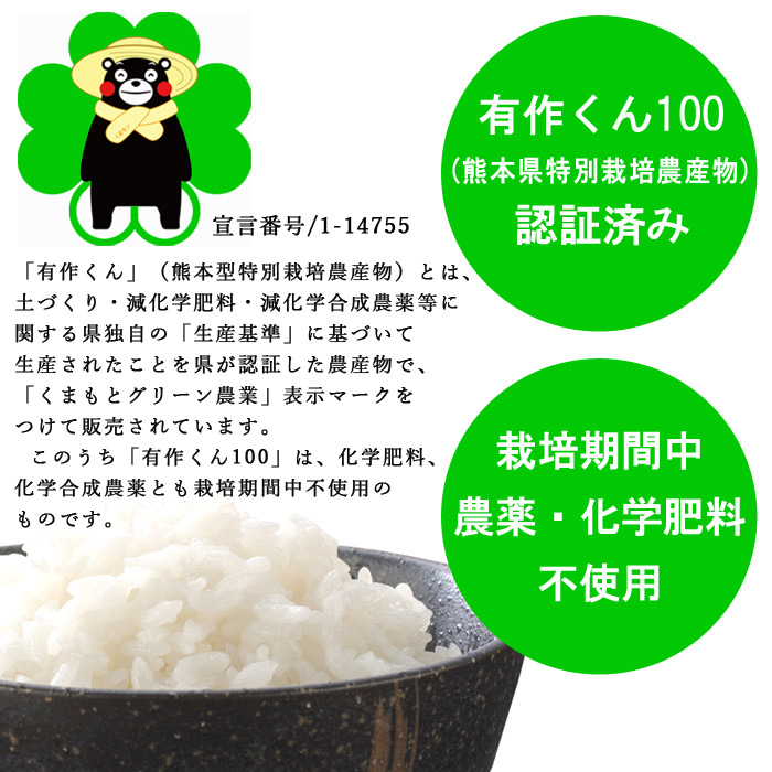 「有作くん」(熊本型特別栽培農産物)は、土づくり・減化学肥料・減化学合成農薬等に関する県独自の「生産基準」に基づいて生産されたことを県が認証した農産物で、「くまもとグリーン農業」表示マークをつけて販売されています。 このうち「有作くん100」は、化学肥料、化学合成農薬とも栽培期間中不使用のものです。